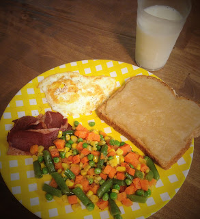 We make this meal about three times a week, if not more! We cook up 2 eggs for each of us (we like ours over easy) and 2 or 3 pieces of turkey bacon per person. We enjoy eating it with frozen mixed vegetables that have been cooked on the stove in a bit of vegetable oil. We then put salt and pepper over everything, eat it up, and then we grab a piece of whole grain bread. We like to put applesauce on our bread, or sometimes peanut butter, and I sometimes enjoy eating it with sliced peaches on top (both fresh and canned).
